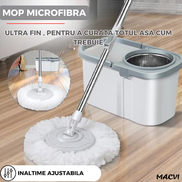 Set Mop Rotativ Macvi®, Galeata, Dubla Actiune, Capat Microfibra, Sistem Stoarcere, Inaltime Ajustabila, Alb/Gri