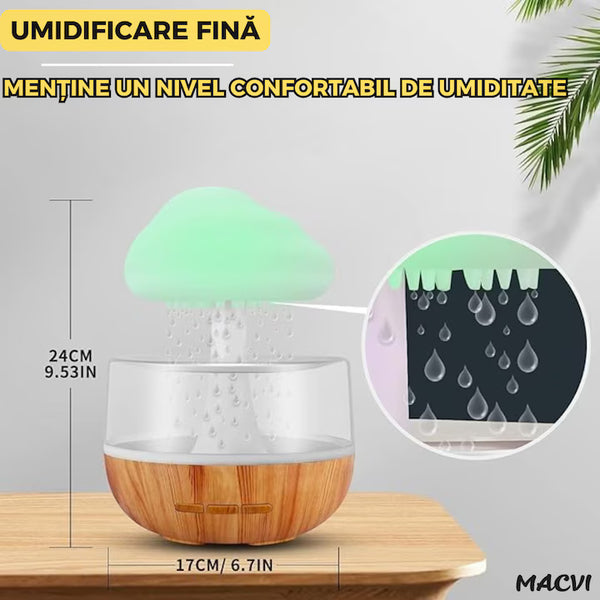 Umidificator si Difuzor Aromaterapie Macvi® Nor de Ploaie, 7 Culori LED, Sunet Relaxant si Sunete Albe, USB, 400 ml