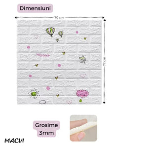 Tapet 3D Autoadeziv, Macvi®, dimensiuni 70x77, Model Caramida Balon Aer Cald, acopera 5.3 metri patrati, este rezistent la apa si ofera un design modern oricarui spatiu