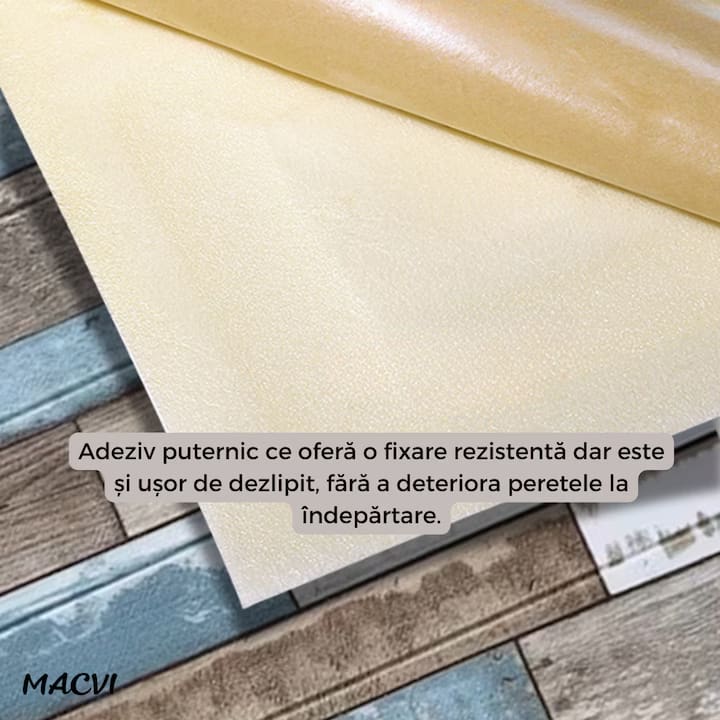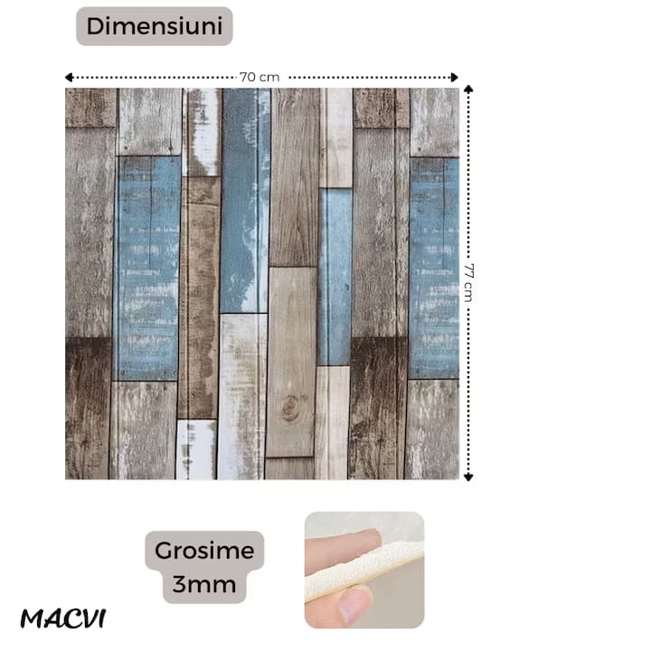 Tapet 3D Autoadeziv, Macvi®, dimensiuni 70x77, Model Caramida Lemn Multicolor, acopera 5.3 metri patrati, este rezistent la apa si ofera un design modern oricarui spatiu