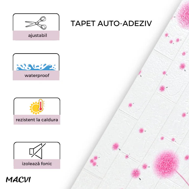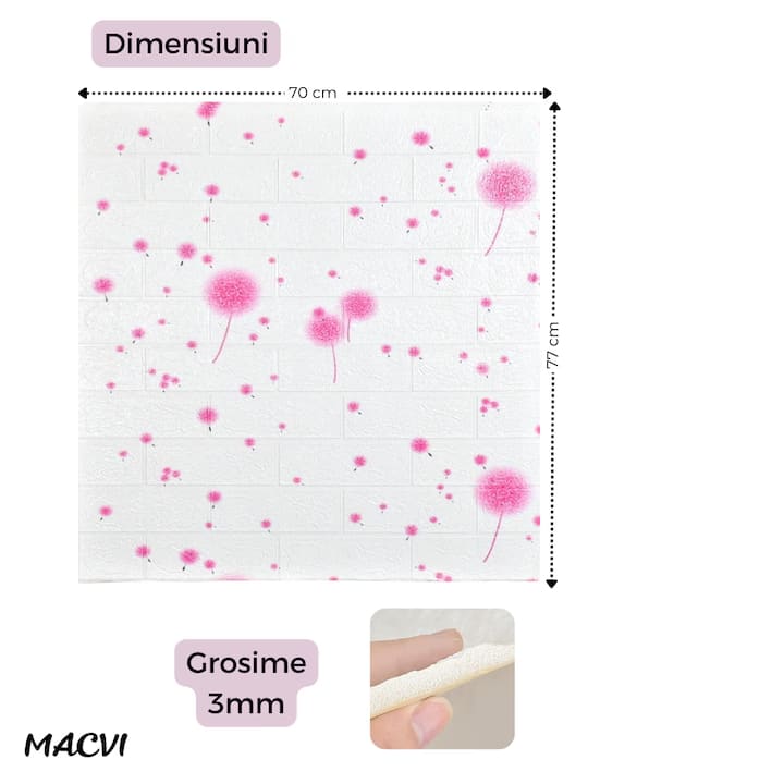 Tapet 3D Autoadeziv, Macvi®, dimensiuni 70x77, Model Caramida Papadie Roz, acopera 5.3 metri patrati, este rezistent la apa si ofera un design modern oricarui spatiu
