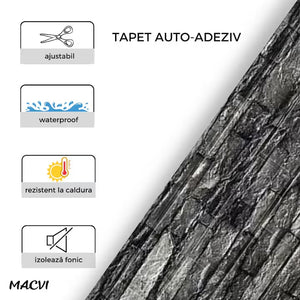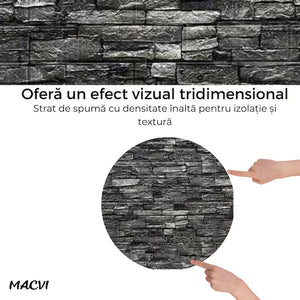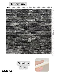 Tapet 3D Autoadeziv, Macvi®, dimensiuni 70x77,Model Caramida Piatra Gri Inchis, acopera 5.3 metri patrati, este rezistent la apa si ofera un design modern oricarui spatiu