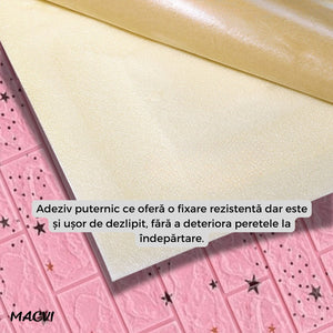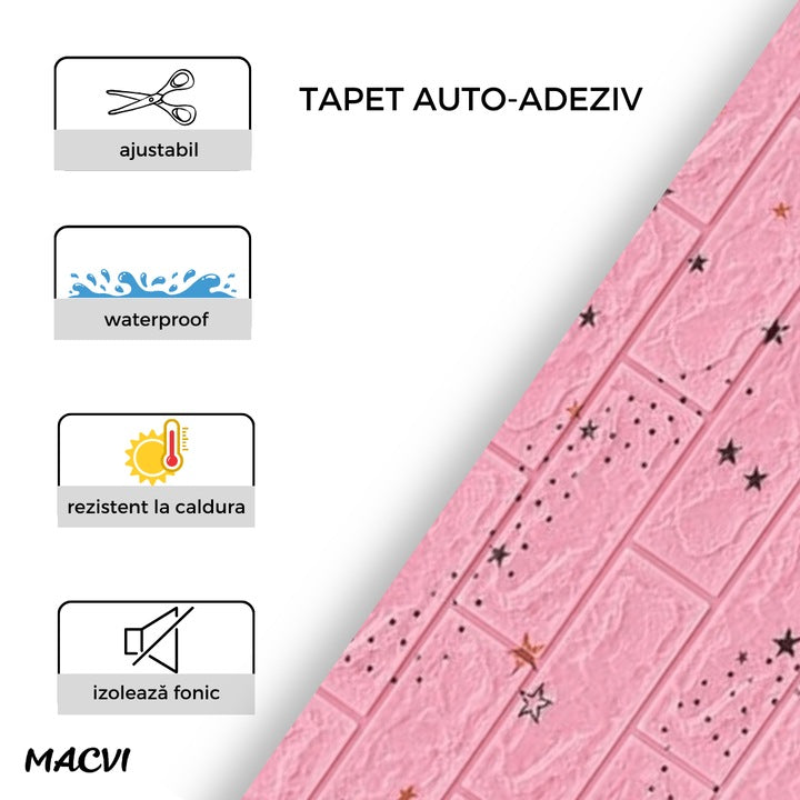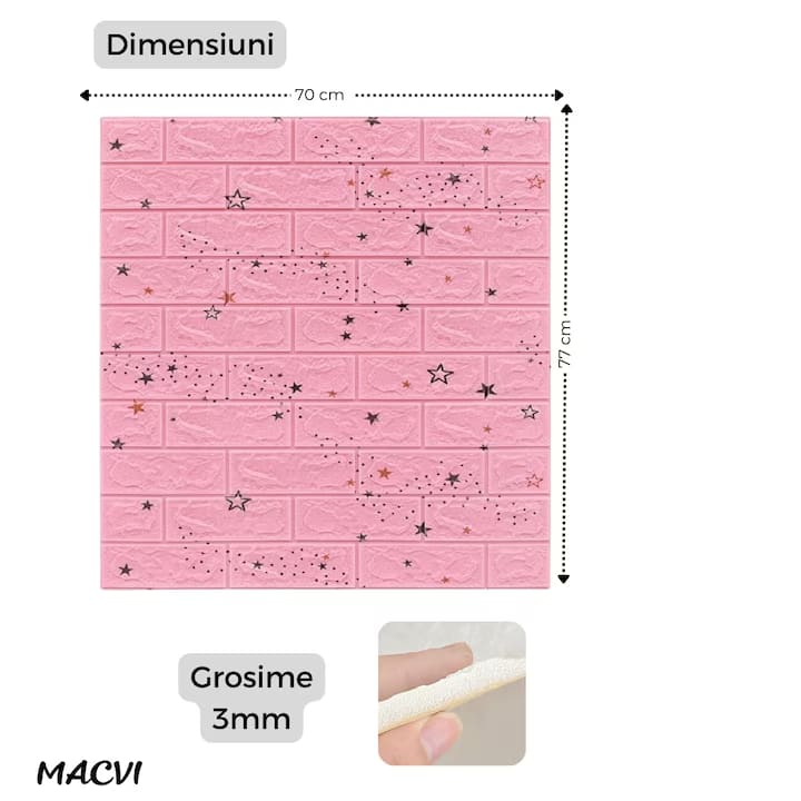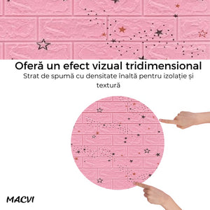Tapet 3D Autoadeziv, Macvi®, dimensiuni 70x77,Model Caramida Stelute Roz, acopera 5.3 metri patrati, este rezistent la apa si ofera un design modern oricarui spatiu