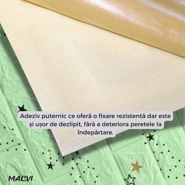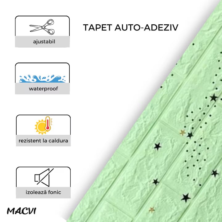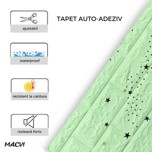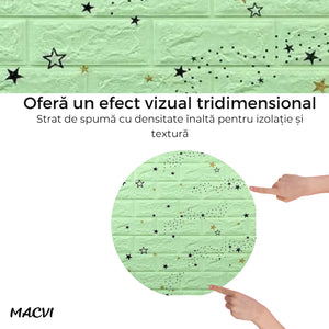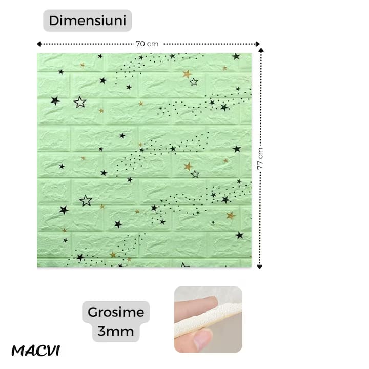 Tapet 3D Autoadeziv, Macvi®, dimensiuni 70x77, Model Caramida Stelute Verde, acopera 5.3 metri patrati, este rezistent la apa si ofera un design modern oricarui spatiu