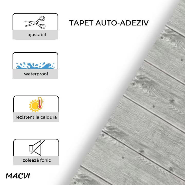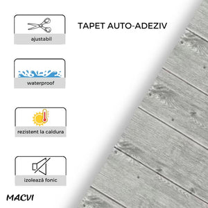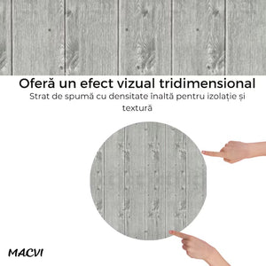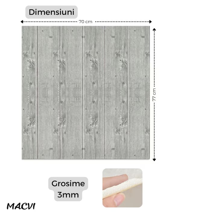 Tapet 3D Autoadeziv, Macvi®, dimensiuni 70x77, Model Panou Lemn Gri Cenusiu, acopera 5.3 metri patrati, este rezistent la apa si ofera un design modern oricarui spatiu