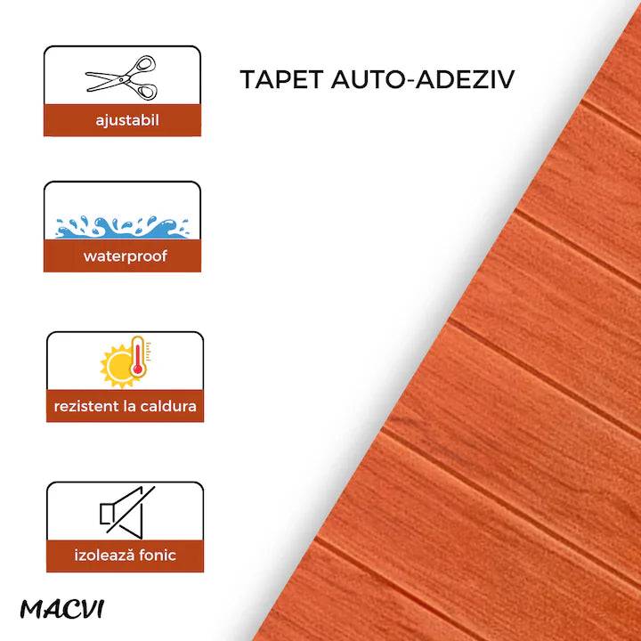 Tapet 3D Autoadeziv, Macvi®, dimensiuni 70x77, Model Panou Lemn Orange, acopera 5.3 metri patrati, este rezistent la apa si ofera un design modern oricarui spatiu